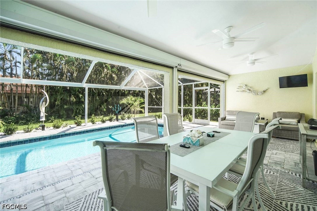 Two guest bedrooms share a bathroom with a walk-in shower and direct access to the pool area. The property has a functional laundry room and a