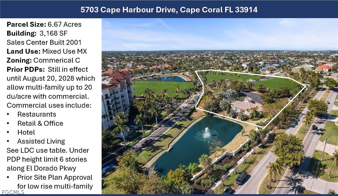 Great opportunity to purchase the last two remaining parcels in the META Section of Cape Harbour. The parcels include a 7.97 vacant acre waterfront parcel adjacent to the Cape Harbour Marina at 5803 Overseas Way and the 6.67 acre parcel at 5703 Cape Harbour Drive. The 5703 Cape Harbour Drive parcel includes a 3,160 sf. Sales Center which may be used as a Sales Center, Restaurant, Office or other commercial use. Mixed use is permitted on both properties and future development may occur under three different options: 1) on the Prior PDP and PDP amendments previously approved, the Marina Villas approved site plans or under the existing MX land use and C zoning district. The 5803 property has infrastructure in place and has the ability to have boat slip spaces along its waterfront. Please call for additional information.